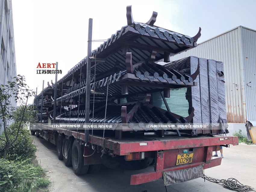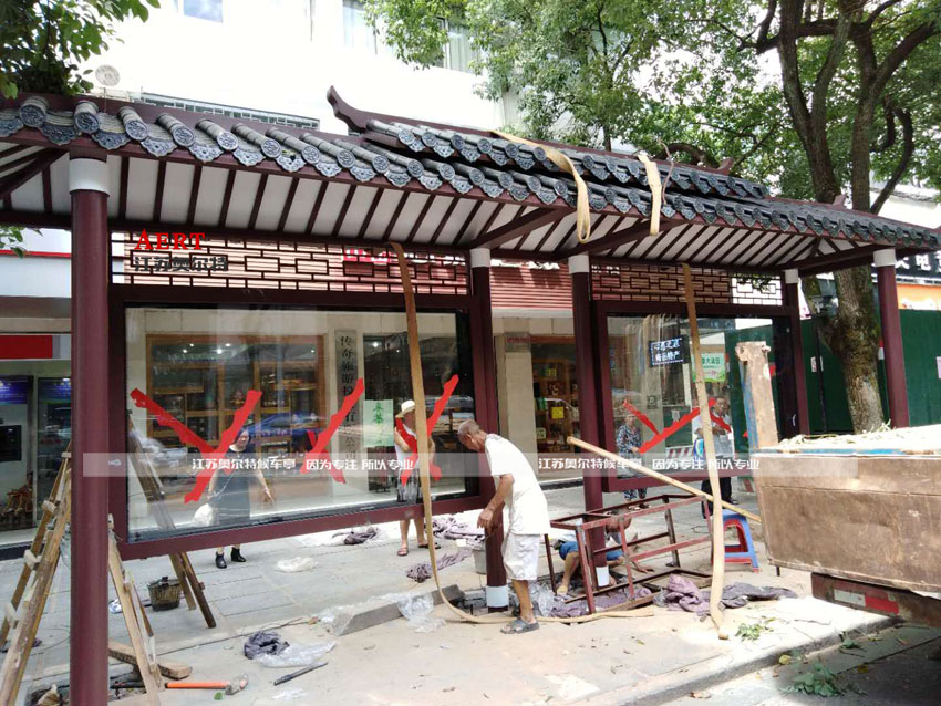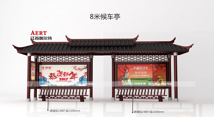 仿古款公交候車亭一(yī)般選用古銅色或者深咖啡色作為(wéi)主色調,亭上裝飾有鏤空雕花的圖案,頂(dǐng)棚則選用仿古瓦(wǎ),箱體則選用常規的箱體製作工藝(yì)就可以。